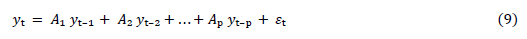where: yt is a vector of n endogenous variables (nx 1), A¡ are coefficient matrices (nxn) for each lag i, εt is an error vector (nx 1) that is considered white noise.