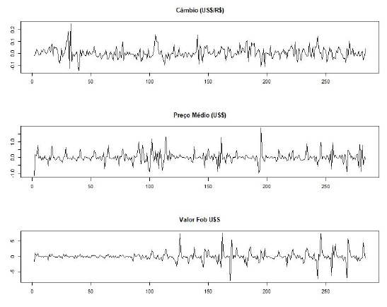 As can be seen, after the tests, the Dickey-Fuller test proved not to have a unit root in the series since the values found for the variables exchange rate, average price, and value of exports were lower than the critical values at 1%, 5%, and 10%. The Augmented Dickey-Fuller test is nothing more than an extension of the previous test but more robust. After the analysis, the stationarity of the residuals obtained by the Ordinary Least Squares method was verified. The Tau statistic was used to test the slope, resulting in the rejection of the null hypothesis, which indicates that the series does not have a unit root and, therefore, is stationary.