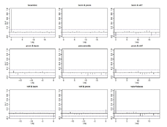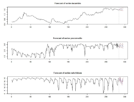 Figure 5 shows how the forecasts are distributed in the VAR model, referring to Table 1C of the appendix. As can be seen in the first two graphs, which correspond to the exchange rate and the average price, respectively, the blue dotted line behaves within the red lines.