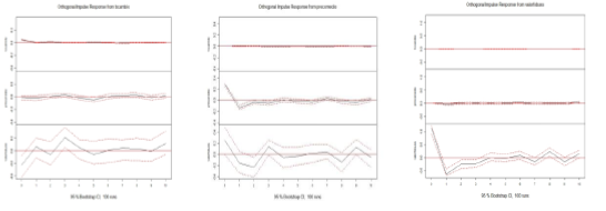 Next, the responses of each variable in the model to unexpected shocks on themselves and the other variables were analyzed. Table 1A, in the appendix, shows numerically the behavior of the three variables to the impulse response data on themselves and on the other endogenous variables in the model over eleven periods. The same results can also be visualized graphically in Figure 3.