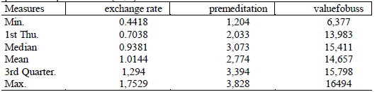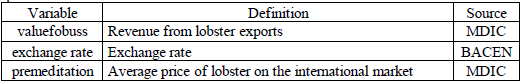 Table 1 shows the values of the logarithm of the exchange rate, average price and revenue from lobster exports. According to the results shown in the Table, the minimum values for the exchange rate, average price and export value were 0.4418; 1.204 and 6.377, while the average values were 10.144; 2.274 and 14.657 and the maximum values of the logarithm were 1.7529; 3.828 and 16.494 respectively.