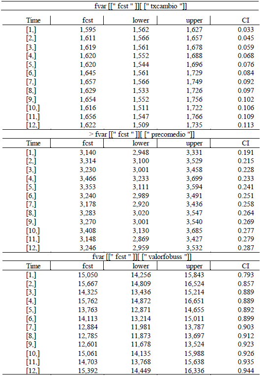 After all the tests have been performed, we can proceed with the forecasts using the VAR model. Table 1C in the appendix presents the estimates of each variable over 12 months. As can be seen, the exchange rate has a forecast within the confidence interval, both in the upper and lower bands, with a confidence level of 95%.