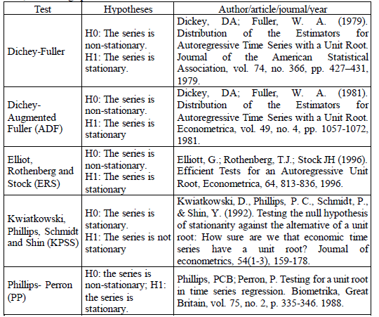 The tests performed to determine whether there is stationarity in the time series were the Dichey-Fuller, Augmented Dichey-Fuller (ADF), Elliot, Rothenberg, and Stock (ERS), Kwiatkowski, Phillips, Schmidt, and Shin (KPSS) and Phillips-Perron (PP) tests, as shown in Table 2 below.