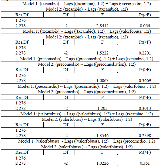 When applying a shock using two lags of the average price variable together with two lags of the exchange rate and, subsequently, with the value of exports, the result showed that the p-value associated with the average price, both with the exchange rate and the value of exports, was higher than the 5% significance level. This indicates that the null hypothesis cannot be rejected. Thus, it can be concluded that the average price does not Granger cause either the exchange rate or the value of exports, showing that a shock in the lagged values of the average price variable does not impact the exchange rate or the value of exports.