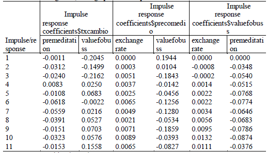 Table 1B, in the appendix, presents the results of the variance decomposition of the forecast error for twelve periods for the variables exchange rate, average price, and export revenue. In the exchange rate component, as expected, its decomposition explains 100% of its forecast error. At the end of the period analyzed, this value remains high, falling only to a percentage of 95.5%. The average price explains 0% in the first period and has little influence over time, explaining only 3.5% of the exchange rate forecast error. On the other hand, the value of exports has an even more negligible impact, causing less than 1% of the variance of the exchange rate forecast error.