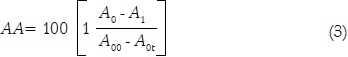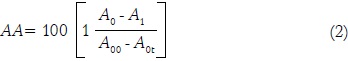 Donde, AA = porcentaje de inhibición de radicales libre DPPH; A0= absorbancia de la solución con el extracto en el tiempo cero; A1= absorbancia de la solución con el extracto en el tiempo t; A0t = absorbancia de la solución sin el extracto en el tiempo t; A00 = absorbancia de la solución sin el extracto en el tiempo cero.