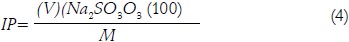 Donde, IP = índice de peróxidos; V = volumen gastado de tiosulfato; M = masa de la muestra (g); Na2 SO3O3 = normalidad (0,0096N).