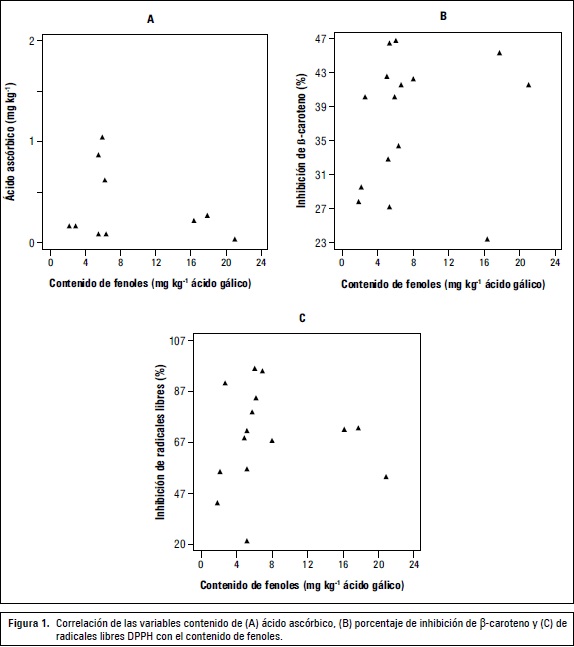Correlación de las variables contenido de ácido ascórbico, b-caroteno y porcentaje de inhibición de radicales libres 2,2-difenil-1-picrylhydrazyl (DPPH) con el contenido de fenoles