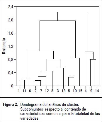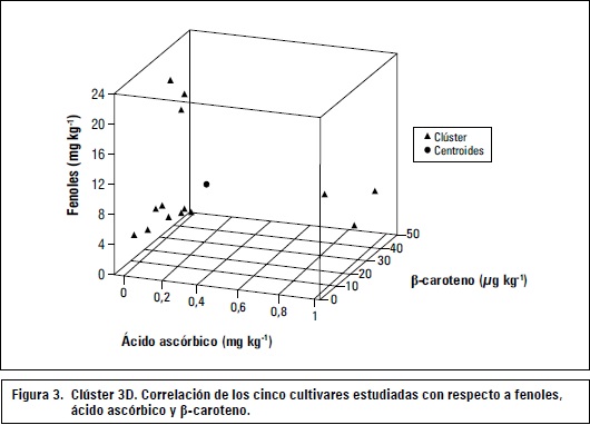 Este análisis se realizó con el fin de aprovechar características comunes para su agrupación (figura 2) donde las observaciones son agrupadas en un rango de distancias usando el método euclidiano. Para este caso los grupos presentaron características totalmente diferentes ya que se agruparon datos del contenido de ácido ascórbico, fenoles e inhibición de b-carotenos, sin tener relación directa entre ellos ya que cada variable es independiente de las demás y esto se pudo observar con los modelos de regresión simple que se ensayaron para cada una de las correlaciones aplicadas. Los centroides fueron calculados para cada una de las variables; los valores indican el punto en que hay relación directa entre las tres variables (figura 3) y ninguno de los datos de las variables dependientes presentó cercanía a este centroide. Este resultado también confirma que cada variedad de mango analizada tiene comportamiento diferente entre ellas con respecto a la actividad antioxidante, a pesar de pertenecer a la misma familia (Anacardiaceae).