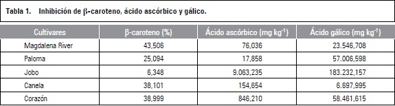 Se encontraron diferencias estadísticas significativas entre cultivares. El factor concentración no mostró diferencias estadísticamente significativas entre cultivares (F=2,17 <Ftab.); para el factor variedad la prueba mostró diferencias estadísticamente significativas (P<0,05 y F=33,49); el porcentaje más alto de inhibición de b-caroteno lo mostró 'Magdalena River' con una media de 43,51% (tabla 1). Cada variedad tiene compuestos que la hacen diferente una de otra, aunque pertenezcan a la misma familia (Anacardiaceae). La variedad que presentó menor inhibición de decoloración de b-carotenos fue Jobo (tabla 1), esto no indica que estos compuestos no estén presentes en esta variedad, ya que la baja actividad antioxidante de una sustancia en el sistema b-caroteno da información de su capacidad protectora en sistemas lipídicos. Estudios en la variedad Kent, determinaron que los carotenos son predominantes casi en 84% de la concentración de carotenoides totales, identificando por HPLC como carotenoides predominantes violaxanthin, neochrom, luteoxanthin y b-caroteno, aunque esto no compromete la fuerza de inhibición de radicales libres por parte de estos carotenoides (Pott et al., 2003). Similarmente, Chen et al. (2005) identificaron y cuantificaron los carotenoides presentes en mango Taiwanese encontrando que todos los trans-b-carotenos y sus cis isómeros constituyeron a la mayor proporción correspondiente a 18,55 mg g-1, seguida de neochrom con 8,36 mg g-1, violaxanthin y sus cis isómeros 2,46 mg g-1, luteoxanthin 2,42 mg g-1, neoxanthin 1,55 mg g-1, presentándose en el mango 'Magdalena River' un í ndice de i nhibición del 43,506%, dada la cantidad de carotenoides en el fruto.