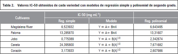 Para obtener el IC-50 que es la concentración a la cual se inhibe el 50% del radical, se utilizó la ecuación que mejor se ajustó al modelo de regresión aplicado a cada variedad. Para ajustar el modelo de regresión los datos fueron analizados en el software estadístico Statgraphics plus versión 2.0.
