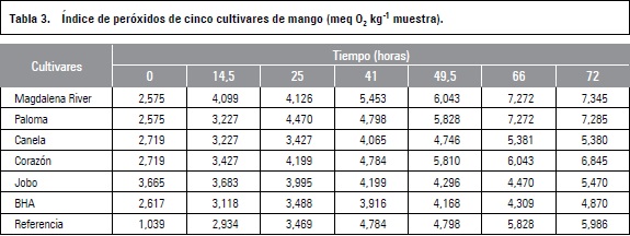 En esta técnica se aprovechó la propiedad que presentan los hidroperóxidos en un gran rango de moléculas, para reaccionar de forma cuantitativa y estequiométrica con el yoduro (Kirk, 2003). El extracto que presentó mayor protección del sistema fue variedad Jobo con un incremento mínimo en el índice de peróxidos a través del tiempo, su comportamiento se encontró por encima del comportamiento de la muestra con BHA; sin embargo, ambas muestras presentaron estabilidad muy parecidas, la matriz lipídica fue la mantequilla. La tabla 3 muestra el comportamiento de cada extracto en esta evaluación, obteniendo un resultado más que satisfactorio para el extracto de 'Jobo', dado que a partir de 1.000 mg kg-1 de este extracto se presentó casi la misma efectividad que BHA a la concentración máxima legislada (175 mg kg-1) según la FDA (Food and Drug Administration, Estados Unidos). Takebashi et al. (2013) muestran valores en hortalizas de 1,63-66,07 mmol TE g-1, en frutas concentraciones de 1,58-33,47 mmol TE g-1, muy parecidas a las concentraciones de cultivares de mango estudiadas.