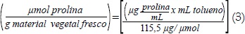 Se pesaron en promedio 0,15 a 0,20 g de material vegetal fresco, el cual se homogenizó en 10 mL de solución acuosa de ácido sulfosalicílico 3% y el homogenizado se filtró a través de papel whatman. Dos mL del filtrado se hicieron reaccionar con 2 mL de ácido ninhidrina y 2 mL de ácido acético glacial en un tubo de ensayo durante 1 h a 100°C, la reacción se detuvo en un baño con hielo. La mezcla de extrajo con 4 mL de tolueno, se mezclaron vigorosamente con un vortex durante 20 s. El cromóforo que contiene tolueno se aspiró de la fase acuosa, se calentó a temperatura ambiente y se leyó la absorbancia a 520 nm utilizando tolueno como blanco. La concentración de prolina se determinó a partir de una curva patrón previamente establecida y se calculó sobre una base de peso fresco de acuerdo a la siguiente fórmula: