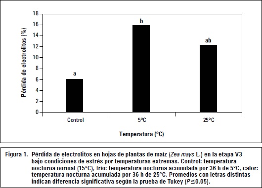Para conocer la influencia de las temperaturas extremas nocturnas en plántulas de maíz sobre la integridad de las membranas celulares, fue medida la pérdida de electrolitos (%) después de las 36 h acumuladas de temperaturas en las plantas a 5°C (frío), 15°C (control) y 25°C (calor). Los resultados se muestran en la figura 1.