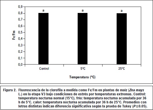 La fluorescencia de la clorofila a medida que la relación entre Fv/Fm fue determinada para las plántulas de maíz estresadas por calor y frío para conocer la influencia de las temperaturas extremas sobre la máxima eficiencia cuántica del fotosistema II. Los resultados, presentados en la figura 2 no arrojaron diferencias significativas entre los tratamientos, indicando que la eficiencia máxima del fotosistema II (Fv/Fm) no se altera a las 36 h acumuladas en plántulas de maíz con temperaturas extremas nocturnas de 5°C o 25°C. Franciszek et al. (2002), en plántulas de maíz bajo estrés por bajas temperaturas (4°C) al tercer día, solo detectaron una caída en la relación Fv/Fm menor del 10% y correspondió a los primeros estados en el aumento lineal de la fluorescencia de la clorofila a (menor Fv/ Fm) de las plantas de maíz. Aroca et al. (2001) midieron parámetros fotosintéticos y mecanismos de protección antioxidante en variedades de maíz sensibles y resistentes al frío, encontrando que 3 d después del estrés por bajas temperaturas (5°C) tanto en las variedades sensibles como resistentes se presentó una reducción significativa del parámetro Fv/Fm, indicando un aumento de la fluorescencia de la clorfila a. Sin embargo, los autores mencionan que la recuperación del parámetro Fv/Fm a sus niveles normales ocurre en términos de horas. En el experimento sobre el efecto de las temperaturas bajas (5°C) en maíz Porva, la medición de la fluorescencia de la clorofila se realizó 2 h después bajo temperaturas ambientales normales (15°C), situación que podría explicar por qué entre los tratamientos de frío y calor no fueron expresadas diferencias para la fluorescencia de la clorofila (Fv/Fm).