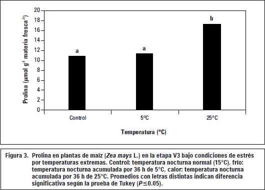 La prolina es un osmolito compatible que ha mostrado un efecto crioprotector en plantas bajo estrés por frío (Mahajan y Tuteja, 2005; Xin y Browse, 1998). También en otros estreses abióticos, la prolina es importante para mantener el equilibrio osmótico y protección de membranas (Hoekstra et al., 2001). La figura 3 presenta los resultados de las mediciones de prolina en las plántulas de maíz en temperatura de 5°C y 25 °C.
