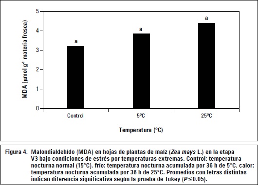El MDA es un compuesto producido por la peroxidación de lípidos durante el estrés oxidativo. El desajuste del estado redox celular da lugar a la aparición de especies reactivas de oxígeno, como O2-, H2O2, OH- y diversos radicales orgánicos, que provocan daños irreversibles en sustancias vitales para el funcionamiento celular como son proteínas y ácidos nucleícos (Hernández y Sanz, 2008). La peroxidación de lípidos es un proceso complejo que implica la formación y propagación de radicales lipídicos, la toma de oxígeno y un reordenamiento de los dobles enlaces en los lípidos insaturados (Gong et al., 2001). Entre los lípidos afectados se pueden encontrar lípidos complejos presentes en membranas biológicas, lo que puede provocar pérdida de su funcionalidad (Serkan, 2012). Como consecuencia de la oxidación de dichos lípidos, se acumula MDA y otros productos de ruptura, como endoperóxidos, alcoholes, cetonas, aldehídos y éteres (Hansen y Dörffling, 1999). El MDA, formado de la ruptura de ácidos grasos insaturados, sirve como un índice adecuado para determinar el daño oxidativo causado en las células (Hernández y Sanz, 2008). La figura 4 presenta los resultados de MDA producido en las plántulas de maíz bajo condiciones de temperaturas bajas y altas.
