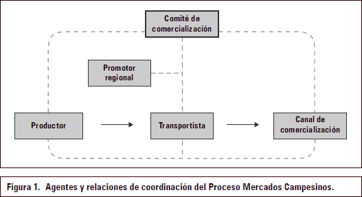 La cadena de suministro de PMC corresponde a una cadena descentralizada, en la cual cada agente ha respondido a intereses y beneficios propios y actúan de forma independiente. El PMC cuenta con un Comité de Comercialización encargado de consolidar la oferta de todos los municipios participantes y la distribución por cliente, tendiendo a actuar como un agente coordinador entre los productores y los compradores. El sistema logístico del PMC no ha logrado funcionar bajo todos los parámetros propuestos para cadenas coordinadas; ya que a pesar de contar con un comité de comercialización, que trata de gestionar todas las actividades de la cadena, agentes como los transportistas han quedado fuera de su marco de acción (figura 1).