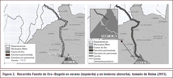 Transporte: en Fuente de Oro, el servicio de transporte es subcontratado a través de un comisionista y se pueden presentar dos escenarios definidos por la variable climática. En época de verano es utilizado un solo modo y medio transporte que es un camión; en invierno se utilizan dos modos, el fluvial y el terrestre, la carretera veredal se inunda y los productos deben atravesar el río Ariari; por lo cual la ruta de desplazamiento resulta ser más larga y costosa (figura 2). La ubicación de los productos en los diferentes modos y medios de transporte se realiza en arrume negro9.