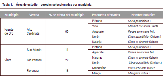 La investigación se llevó a cabo en los municipios de Fuente de Oro (Meta) y Viotá (Cundinamarca); por medio de un muestreo por conveniencia5 se escogieron los dos municipios por la similitud de productos que comercializan, y porque se encuentran en diferentes etapas en el proceso de vinculación al PMC. Mientras el primer municipio está iniciando su vinculación, el segundo lleva un proceso de consolidación de 8 años. En cada municipio, se determinaron las veredas que mayor oferta de producto realizaron en el año 2011 según datos registrados en SIMEC (Sistema de Información de Mercados Campesinos, 2011) (tabla 1) y a estas veredas se les aplicaron los instrumentos de recolección de información.