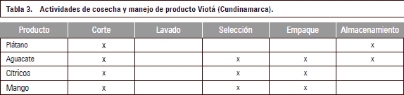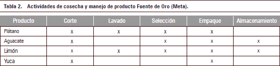 Cosecha y manejo de producto: se realizan las actividades de recolección, clasificación y empaque, las últimas dos actividades varían acorde con el producto; en Fuente de Oro (tabla 2) las actividades incluyen el lavado de algunos de sus productos, en Viotá (tabla 3) esa actividad no se realiza. En cuanto a criterios de clasificación, en los dos municipios se realiza por tamaño de fruto y no se considera la variable de estado de maduración. Los tipos de empaques utilizados varían con el producto (tabla 4), en el caso del plátano proveniente de Fuente de Oro, se utiliza una bolsa plástica, ya que los frutos del plátano son desgajados del racimo, mientras en Viotá no se utiliza empaque y el transporte es en racimo.
