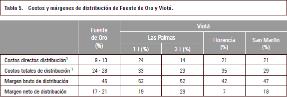 La tabla 5 ilustra las diferentes relaciones entre los ingresos y los costos directos y totales, y los márgenes de distribución de cada uno de los municipios y casos analizados.