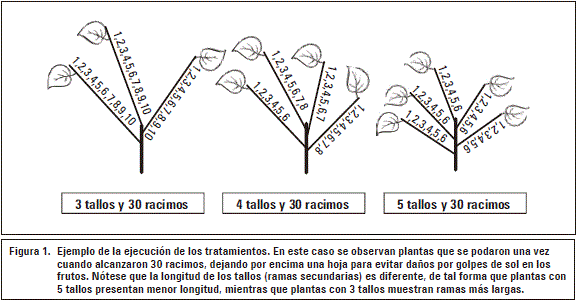 Se utilizó un diseño experimental en bloques completos al azar, con arreglo factorial de tratamientos 3 × 3+1, en donde el primer factor correspondió al número de tallos por planta (3, 4 o 5) y el segundo factor fue el número de racimos por planta (20, 30 o 40), además se incluyó un testigo absoluto sin ninguna de las anteriores podas. Cada unidad experimental estuvo compuesta por tres plantas, para un total de 120 plantas. Los tratamientos y sus abreviaturas fueron: 3T+20R (3 tallos + 20 racimos); 3T+30R (3 tallos + 30 racimos); 3T+40R (3 tallos + 40 racimos); 4T+20R (4 tallos + 20 racimos); 4T+30R (4 tallos + 30 racimos); 4T+40R (4 tallos + 40 racimos); 5T+20R (5 tallos + 20 racimos); 5T+30R (5 tallos + 30 racimos); 5T+40R (5 tallos + 40 racimos); testigo (sin poda) (figura 1).