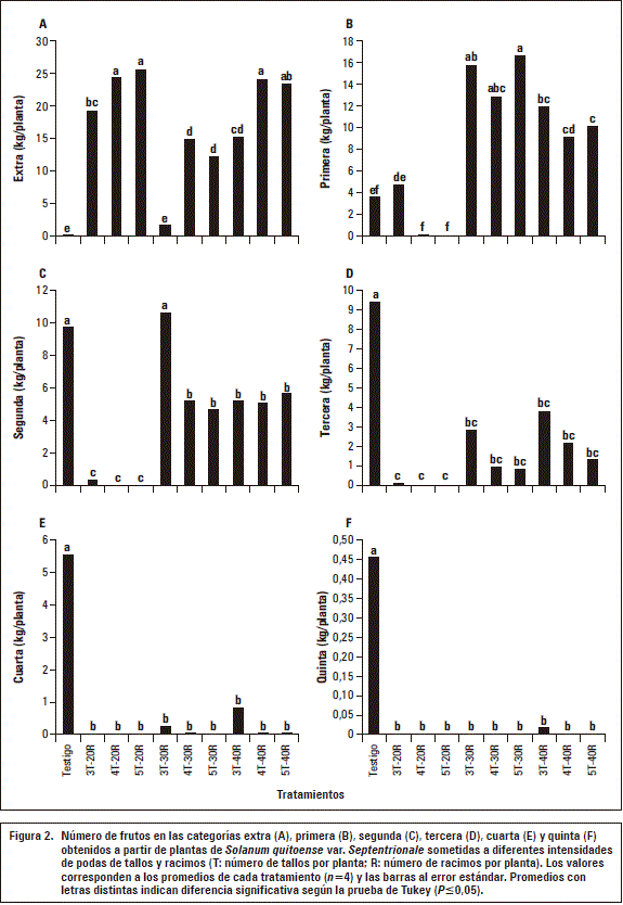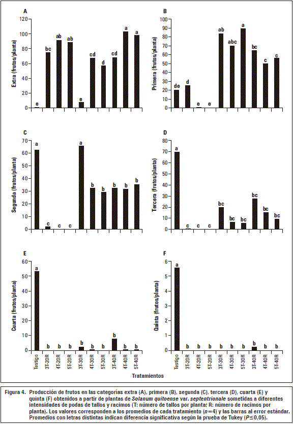 Los tratamientos con 20 racimos (3T-20R, 4T-20R y 5T-20R) presentaron una producción nula a partir de la categoría segunda (figuras 4C, 4D, 4E y 4F); este comportamiento fue similar al de las plantas con 40 racimos, aunque estas últimas produjeron algunos frutos de segunda y tercera calidad (figura 4C y 4D). El tratamiento 3T-30R mostró la más alta producción en la categoría segunda y diferencias significativas (P≤0,05) con los demás tipos de podas.