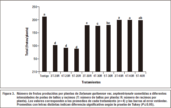 Número total de frutos. El tratamiento que presentó el mayor número de frutos por planta fue el testigo, aunque sin diferencias estadísticas con ninguno de los tratamientos en los cuales se dejaron 40 racimos por planta, independiente del número de tallos (figura 3). Este comportamiento del testigo coincide con lo reportado por Gautier et al. (2001) en plantas de tomate con una alta carga de frutos que presentaron menor área foliar y, por consiguiente, los carbohidratos pueden ser el factor limitante, produciendo frutos de bajo calibre.