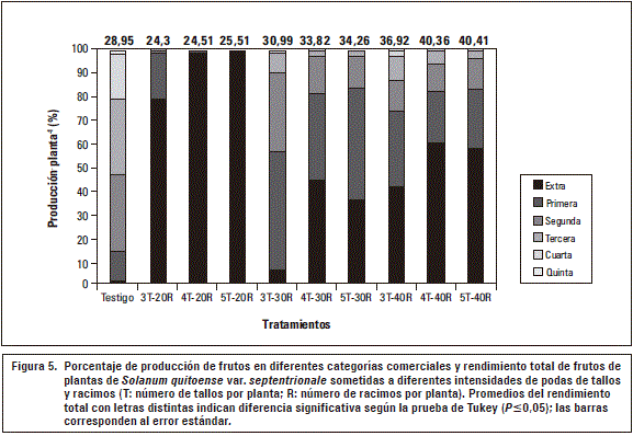 Producción porcentual según categoría. El testigo presentó la distribución de las categorías de calidad más homogénea, pero de menor calidad (figura 5), por consiguiente, el efecto de no realizar poda en plantas de lulo no favorece la producción de ninguna categoría en especial (figura 5). Los tratamientos que involucraron 20 racimos fueron los que menor producción tuvieron, pero casi exclusivamente en la calidad extra, lo que sugiere que plantas con un menor número de racimos tienden a presentar un mejor llenado de frutos, obteniendo una mejor calidad en comparación con otros tratamientos, debido a una menor competencia entre frutos. Allen et al. (2004) señalan que los frutos son considerados fuertes demandas y, al eliminarlos (en este caso podar los racimos florales), una cantidad significativa del flujo de fotoasimilados es traslocado a los frutos remanentes en las ramas restantes.