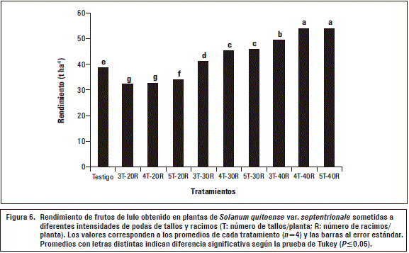 Los rendimientos obtenidos en los diferentes tratamientos (figura 6) están dentro del rango que mencionan Bonnet y Cárdenas (2012) con 10 a 160 kg por planta, pero siendo en todos los casos mayores a los reportados para las diferentes zonas productoras del país. Muñoz (2011) reporta que en la zona oriental de Caldas en sistemas de monocultivo del lulo "La Selva", se obtienen rendimientos un poco superiores a las 15 t ha-1 bajo un sistema de producción tipo empresarial; mientras que Agronet (2015) reporta que los principales departamentos productores que son Huila, Valle del Cauca, Tolima, Antioquia, Nariño y Norte de Santander, presentan un rendimiento promedio de 8,5 t ha-1. Esta variación tan alta al comparar el rendimiento obtenido en esta investigación con los reportados puede deberse a que existen diversos factores que varían en el sistema productivo y que implicarían incrementos o disminuciones en la producción, como lo son el genotipo sembrado, la densidad de plantas/ha, el sistema de producción (a libre exposición o bajo sombrío), así como otras prácticas como la siembra con cultivos intercalados, sistema de tutorado, condiciones ambientales, entre otros (Casierra-Posada y Fischer, 2012; Criollo et al., 2014).