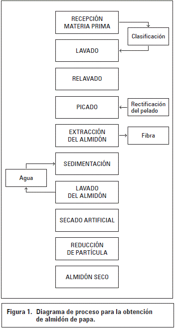 Los tubérculos de papa se clasificaron por sanidad, se limpiaron y se retiró manualmente la epidermis. Los almidones se obtuvieron según metodología descrita por Singh y Singh (2001), tomando 1 kg de cada una de las variedades. Se fraccionó y se colocó el producto en agua destilada con metabisulfito de sodio (35 g/100 L). Posteriormente se procedió a la extracción del almidón, se lavó varias veces con agua destilada hasta que el líquido efluente fue claro (Singh y Singh, 2001). El almidón se dejó reposar, decantar y se filtró. La pasta resultante se llevó a una estufa de aire caliente a 40°C por 24 h. Obtenido el almidón seco, se pasó por un molino pulverizador marca Cemotec® 1090 SampleMill (Foss Tecator AB, Höganäs, Suecia), para reducir el tamaño de partícula, se tamizó usando la malla número 100 y finalmente fue almacenado en bolsas con cierre hermético, como se describe en la figura 1.
