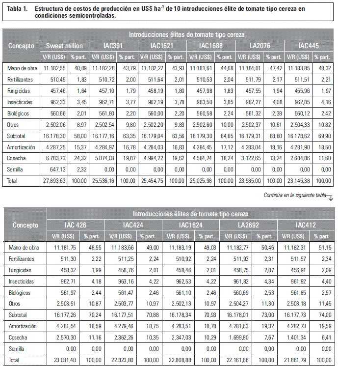 El costo más alto de producción lo tiene el híbrido Sweet million con US$27.893,63 por ha, la participación de la cosecha en los costos fue alto con el 24,32% de los costos totales, debido a su alto rendimiento con 41.665 kg ha-1 (tabla 2), seguido de las introducciones IAC391, IAC1621 y IAC1688 con participaciones del 19,87%, 19,62% y 18,24% de los costos totales respectivamente (tabla 1). Las introducciones LA2692 y IAC412 fueron las de menor porcentaje de participación en mano de obra de la cosecha en los costos totales con 7,67% y 6,41%, respectivamente, fundamentalmente por sus bajos rendimientos con 10.441 kg ha-1 y 8.600 kg ha-1, respectivamente (tabla 2). Es de resaltar la introducción IAC391 que presentó el valor más alto de la cosecha con US$5.074,03 de las introducciones evaluadas (tabla 1). Testa et al. (2014), obtuvieron un costo de producción de tomate tipo cereza cultivado en 30 invernaderos en media de US$229.570.