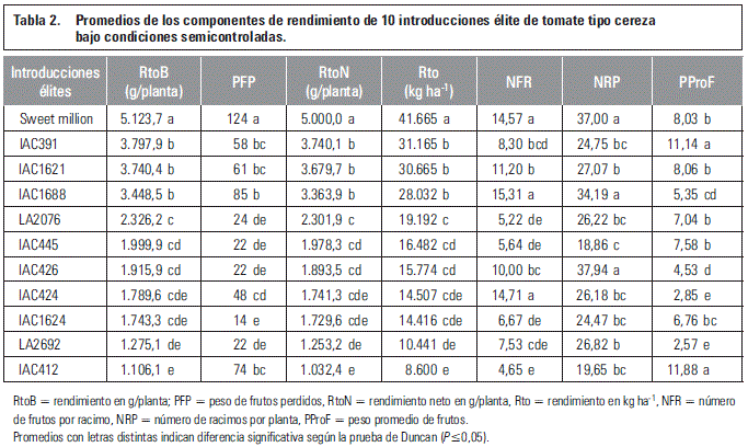 De la evaluación de los componentes del rendimiento se observaron diferencias significativas (P:s:0,05) conforme a la tabla 2. Para el comportamiento de la variable número de racimos por planta (NRP), sobresale la introducción IAC426 con 38 racimos/planta, seguido por Sweet million e IAC1688 con 37 y 34 racimos por planta, respectivamente. Entretanto, las introducciones IAC1621 y LA2692 tuvieron un comportamiento medio con valor de 27 racimos/planta, en tanto las introducciones LA2076, IAC424, IAC391 y IAC412 mostraron resultados de 26, 25, 24 y 20 racimos/planta, respectivamente. En contraste, las introducciones IAC426 e IAC412 fueron las de peor comportamiento con diferencia cercana al 50% de 19 racimos/planta en promedio con las de mejor comportamiento (tabla 2).