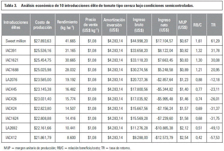 The cherry tomato, being a crop of fast economic return, has aroused the interest of producers, but there is little information on the costs of production and profitability in the domestic market, which prevents crop expansion. Thus, the objective of this study was to evaluate 10 economically elite introductions of cherry tomato under controlled conditions in the Colombian Andes. The study was conducted on the Tesorito Farm owned by Caldas University located in the city of Manizales (Colombia). The experimental design used completely randomized blocks with 10 treatments (elite introductions) and a commercial control (Sweet million), with four repetitions. The physiological variables were: yield (g/plant), weight of lost fruits, net yield, yield in kg ha-1, number of fruits per cluster, number of bunches per plant, and average fruit weight. The following economic variables were estimated: production costs, production unit margin, cost benefit ratio, and rate of return; in addition, a sensitivity analysis was performed. The results showed that the IAC 391, IAC 1621 and IAC 1688 introductions exceeded the financial perspective under the studied conditions, making these materials options for producers.