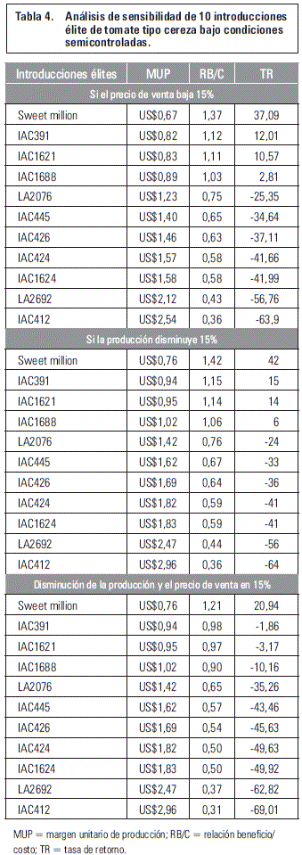 Para finalizar, el análisis de sensibilidad tiene como objetivo evaluar el impacto generado por el cambio del precio y los rendimientos del cultivo, pudiéndose determinar cuál es la introducción más rentable frente a la fluctuación del precio de venta y cantidad de frutos cosechados. De esta manera, en el caso de que el rendimiento caiga en un 15%, el híbrido Sweet milliion y las introducciones élite IAC391, IAC1621, IAC1688, continúan siendo atractivas económicamente, ya que la relación beneficio/costo sigue siendo positiva, comportamiento similar se presenta cuando el precio de venta disminuye en un 15% (tabla 4). Asumiendo que la producción y el precio baje en un 15% se nota que solo el hibrido Sweet million es económicamente viable con un ingreso neto de US$5.628,26, con un margen unitario de producción de US$0,76 por debajo del valor de venta (US$1,08) y una relación beneficio/costo de 1,21, lo que indica que por cada peso invertido tenemos una utilidad de 21 centavos con una eficacia de 20,94%.