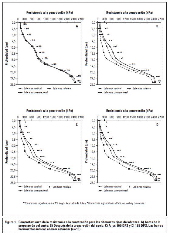 La resistencia a la penetración se determinó con un penetrómetro cónico digital Fieldscout SC 900 (Spectrum Technologies, Aurora, IL), para lo cual se tomaron muestras hasta una profundidad de 25 cm, cada 2,5 cm, con lo cual se obtuvo un total de 11 datos, los cuales fueron medidos en cuatro épocas: época 1 (E1): antes de la preparación del suelo; época 2 (E2): se realizó en el momento de la preparación del suelo para determinar si se presentaba algún cambio en las propiedades físicas con la utilización de los aperos en la labranza; época 3 (E3): se llevó a cabo a los 100 d después de la siembra, con el fin de observar el cambio en las variables evaluadas a lo largo del tiempo y el efecto del crecimiento longitudinal de las raíces en las propiedades físicas; época 4 (E4): se realizó a los 185 d después de la siembra.