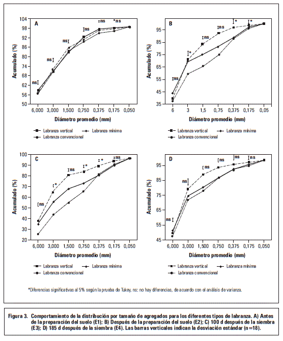 Para el porcentaje acumulado de agregados en la primera evaluación antes de la preparación, se parte de un suelo estadísticamente homogéneo, donde el promedio de agregados con un diámetro superior a 6 mm fue del 57,61%, y entre los agregados de 1,5 y 3 mm hay un promedio de 13,11%; se observan agregados con porcentajes inferiores a 0,375 mm como los menos ideales en un suelo con un promedio de 5,56%, teniendo en cuenta que una proporción alta de microagregados se puede considerar como indicador de degradación estructural del suelo (Baumgarten et al., 2012). De igual manera, si hay un mayor número de agregados entre 1 y 3 mm que estén distribuidos en forma tal que la capa no sea completamente homogénea, las relaciones de intercambio gaseoso son mejores y el suelo puede adquirir y conservar mayor cantidad de agua (Lal y Shukla, 2004).