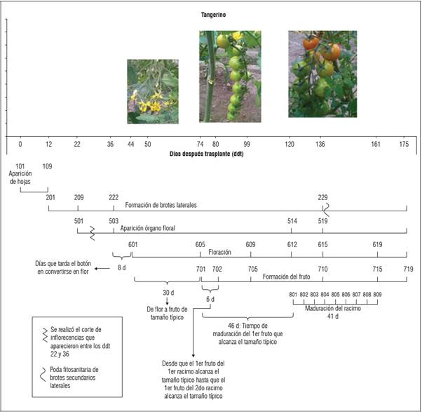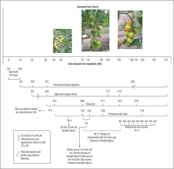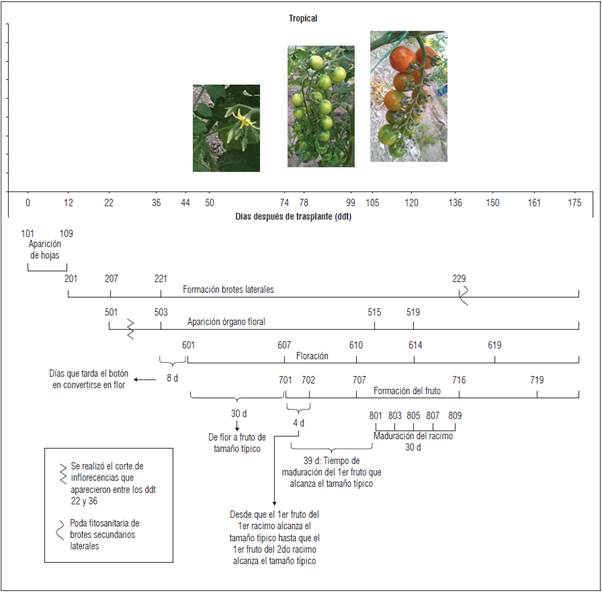 Se encontró que en los tres materiales genéticos evaluados el inicio de los estadios fenológicos principales ocurrió en los mismos ddt. Solo se encontraron variaciones en cuanto a los estadios fenológicos secundarios. Tangerino evidenció un desarrollo más precoz en el caso de formación de brotes laterales. Para los tres materiales evaluados, la aparición del órgano floral ocurrió en un periodo aproximado de 22 ddt, mientras que la floración se evidenció a los 44 ddt y la formación del fruto una vez transcurridos 74 ddt (Figs.1, 2 y 3). No obstante, en cuanto a la aparición del órgano floral, floración y formación del fruto, 'Tropical Cherry' y 'Red Cherry' evidenciaron un comportamiento más precoz respecto a 'Tangerino, ya que alcanzaron los estadios secundarios dentro de estas etapas en un menor número de ddt (Figs. 1, 2 y 3). En cuanto a la maduración del racimo, 'Tropical Cherry' fue más precoz, completando la totalidad del proceso de maduración del racimo en 30 d, respecto a los 41 d que tardaron los otros materiales evaluados.