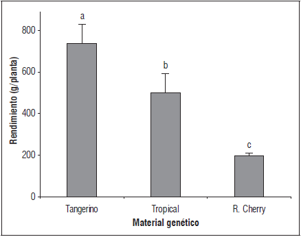 Figura 5 Rendimiento de tres genotipos de tomate cherry. Promedios con letras distintas indican diferencia significativa según la prueba de Tukey (P≤0,05). Las barras de error indican el error estándar.