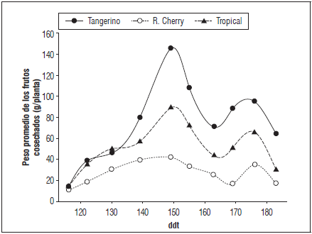 En el ciclo de cultivo se encontraron dos picos de producción; a los 149 y 176 ddt para los tres genotipos evaluados, siendo Tangerino el que presentó valores superiores para la variable en el tiempo, e igualmente, tuvo los picos de mayor proporción en estos dos periodos mencionados, alcanzando hasta 150 g/planta de producción a los 149 ddt (Fig. 6). 'Red Cherry' mostró los menores valores de esta variable durante todo el experimento, alcanzando tan solo un máximo aproximado de 40 g/planta a los 149 ddt. Tropical se situó en un nivel intermedio de producción, alcanzando un máximo de 80 g/planta para los frutos cosechados a los 149 ddt (Fig. 6).