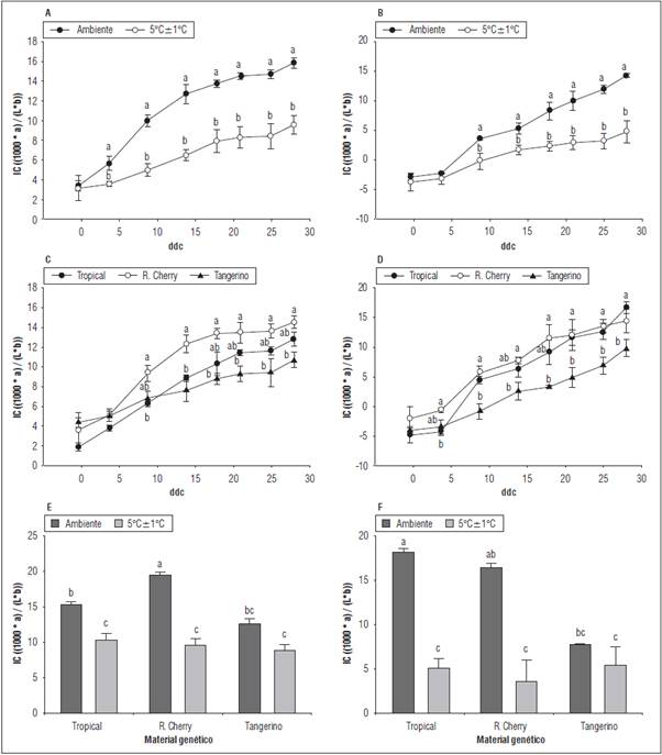 El efecto combinado de la temperatura y el material genético sobre los frutos cosechados, tanto en verde como en rojo, mostró que los mayores IC se presentaron en los frutos almacenados a temperatura ambiente y que estos fueron significativamente mayores al de los frutos almacenados a 5±1°C, este es el caso de 'Tropical Cherry' y 'Red Cherry' (Figs. 7E y F). Dicho comportamiento fue consistente a partir de los 9 ddc hasta el final del periodo de evaluación (28 ddc). Para 'Tangerino' no hubo una reducción significativa del IC cuando los frutos se almacenaron en refrigeración independientemente del estado de madurez de cosecha. Los resultados de la interacción de los factores concuerdan con el evidenciado para el efecto individual de la temperatura y el material genético. Para el caso de 'Tangerino', la ausencia de diferencias entre frutos rojo claro y torneados almacenados a temperatura ambiente y a 5±1°C, indican que la refrigeración no juega un papel crucial en proceso de maduración de los frutos de este material, si se considera únicamente el IC como indicador del proceso de maduración.