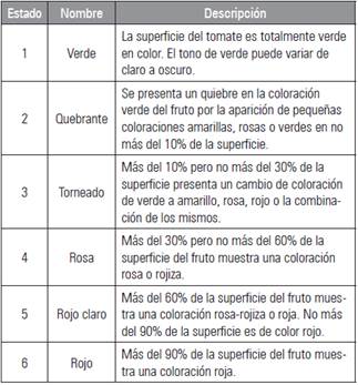 Se llevó a cabo la cosecha de frutos en los estados de maduración torneado (estado 3) y rojo claro (estado 5) de acuerdo con la escala de clasificación por color de tomate del Departamento de Agricultura de los Estados Unidos, USDA (UCDAVIS, 2016). La tabla 1 presenta la descripción de los estados de madurez según el cambio de coloración en la superficie del fruto.