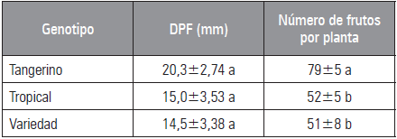 Tabla 2 Diámetro promedio del fruto (DPF) y número de frutos de los tres genotipos evaluados.
