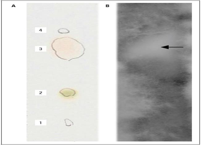 Figura. 3 Fracción activa del aceite esencial de L. origanoides. (A) fraccionamiento del aceite esencial mediante Cromatografía en Capa Fina, (B) fracción activa para R. solani.