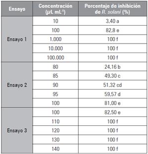 Se establecieron tres ensayos para determinar la concentración mínima de aceite esencial que inhibe el crecimiento de R. solani. Diluciones del ensayo 1: 10, 100, 1.000, 10.000 y 100.000 μL mL-1; ensayo 2: 80, 85, 90, 95 y 100 μL mL-1 y ensayo 3: 100, 110, 120, 130 y 140 μL mL-1. En cada ensayo se utilizó un diseño experimental completamente al azar con quince repeticiones. La unidad experimental correspondió a una caja de Petri. Los tratamientos correspondieron a las concentraciones definidas en cada ensayo y comparadas con el testigo absoluto que no fue enmendado.