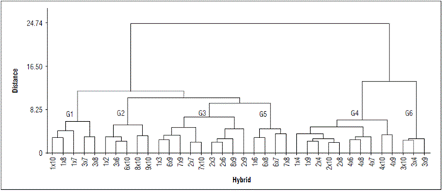 Figure 1. Dendrogram of Hierarchical Classification Analysis for 36 hybrids between nine double haploid P. peruviana lines.