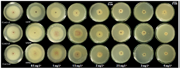 Figure 1. Different chitosan molecules in increasing concentrations inhibit Fol59 mycelial growth under in vitro conditions at seven days after incubation at 25°C.