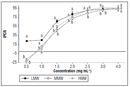 Low concentrations of MMW, HMW and commercial chitosan promoted the growth of Fol (Tab. 1), and that fact can be related to the hormesis phenomenon, which is defined as the response of organisms to a toxic component, which in low concentrations produces a beneficial effect. This response is related to a metabolic overcompensation, triggered by an adaptive response to stress induced by a determined substance (Vargas-Hernandez et al., 2017).