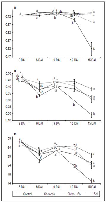 The chlorophyll content is shown in the table 6 and was stable until 12 DAI. From 15 DAI in the plants of the pathogenic treatment, chlorophylls a and b showed a decrease of 39% to the control; meanwhile, in the Chtsn + Fol treatment, the contents remained stable without significant differences compared to the control (Tab. 6). The carotenoid content was not altered in any of the treatments during the experiment. The decrease in chlorophyll concentrations is consistent with the appearance of chlorosis in plants only infected with Fol.
